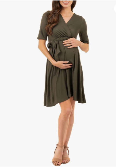 Mother Bee Maternity Knee Length Wrap Dress with Adjustable Belt