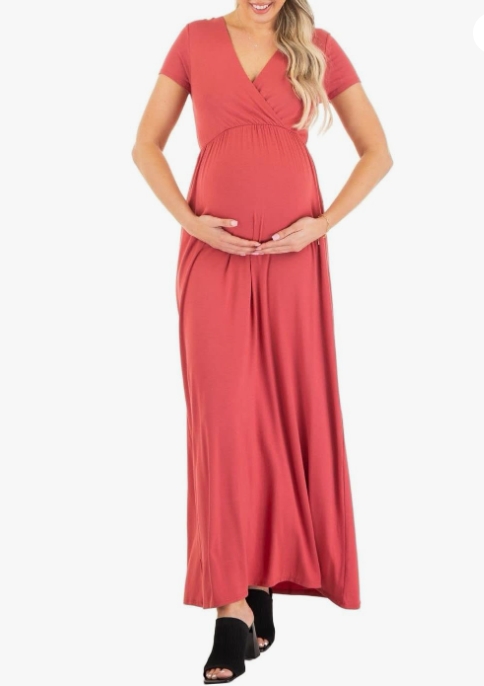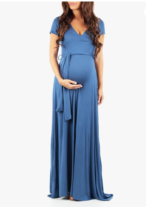 Mother Bee Maternity Short Sleeve Ruched Waist Faux Wrap Maxi Dress