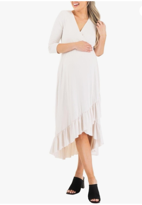 Mother Bee Maternity Short or 3/4 Sleeve Hi-Low Ruffle Faux Wrap Dress